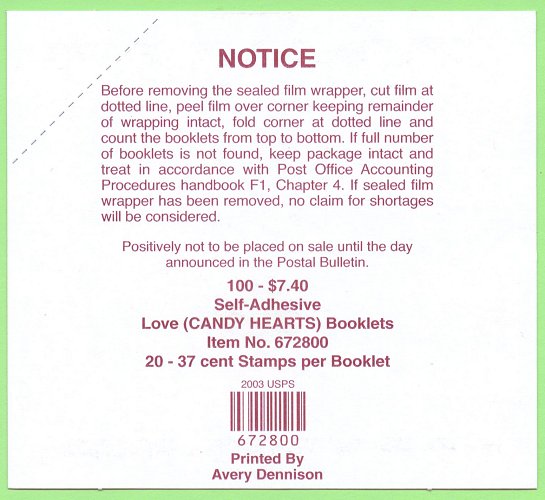 Distribution: Item 672800, $7.40 Love - Candy Hearts PSA Convertible Booklet of 20