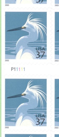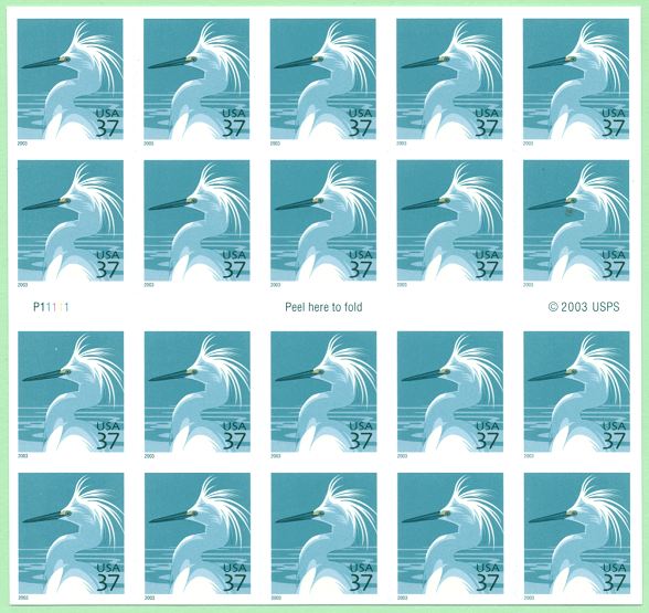 Official Announcement | The Postal Service will issue a 37-cent Snowy Egret definitive stamp (Item 672600) in a pressure-sensitive adhesive (PSA) convertible booklet of 20 on January 30, 2004, in Norfolk, Virginia. The stamp, designed by Carl T. Herrman, Carlsbad, California, goes on sale nationwide January 31, 2004. The Snowy Egret stamp features artist Nancy Stahl's rendering of a snowy egret, which is considered one of the most beautiful American birds. The stamp art, based on photographs, depicts the head and upper body of a snowy egret against a blue background. This stamp was issued in a coil of 100 on October 24, 2003, in New York, New York. |