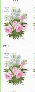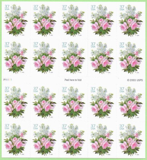 Official Announcement | The Postal Service ™ will issue a 37-cent Garden Bouquet (Weddings) commemorative stamp and a 60-cent Garden Botanical (Weddings) commemorative stamp on March 4, 2004, in New York, New York. The 37-cent Garden Bouquet (Weddings) stamp (Item 673500) is produced as a pressure-sensitive adhesive (PSA), single-sided convertible booklet of 20, and the 60-cent (2-ounce rate) Garden Botanical (Weddings) stamp (Item 566200) is produced as a PSA pane of 20. The 60-cent Garden Botanical (Weddings) pane of 20 may be split, and the stamps may be sold individually. The stamps, designed by Richard Sheaff, Scottsdale, Arizona, go on sale nationwide March 5, 2004.The 37-cent stamp features a bouquet of white lilacs and large pink roses. Garden Bouquet, as this stamp is known, may be used for one-ounce First-Class Mail® envelopes, including the response envelope often enclosed in a wedding invitation. Garden Botanical features a drawing of mostly pink wild roses. At a 60-cent denomination, this stamp will accommodate the extra weight of a wedding invitation as well as other mailings such as oversized cards or small gift enclosures that require extra postage. These stamps are part of the Love series. The first Love stamp was issued by the Postal Service in 1973. Since that time, Love stamps have featured a wide range of subjects including flowers, animals, cherubs, and love letters, as well as abstract designs. |