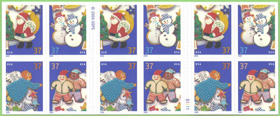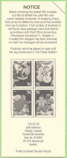 Official Announcement | The Postal Service ™ will issue 37-cent, Holiday Cookies special stamps in four designs, on October 20, 2005, in Minneapolis, Minnesota, and New York, New York (Mega Stamp Show). The stamps designed by Derry Noyes of Washington, DC, go on sale nationwide on October 21, 2005.In celebration of the winter holiday season, the stamps feature festively decorated cookies. Two snowmen, two elves (one sugar cookie and one gingerbread), an angel, and Santa Claus are all part of the delicious fun, adding homemade warmth to seasonal correspondence. The stamps will be issued in a pressure-sensitive adhesive (PSA) pane of 20 stamps (Item 567500), a double- sided booklet of 20 stamps (Item 674000), and a folded vending booklet of 20 stamps (Item 674100). |