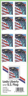 • Plate numbers Cover Side: Barcode 674400 • "Lady Liberty and U.S. Flag" • Stamp image • "Twenty First-Class Self-adhesive Stamps" |
