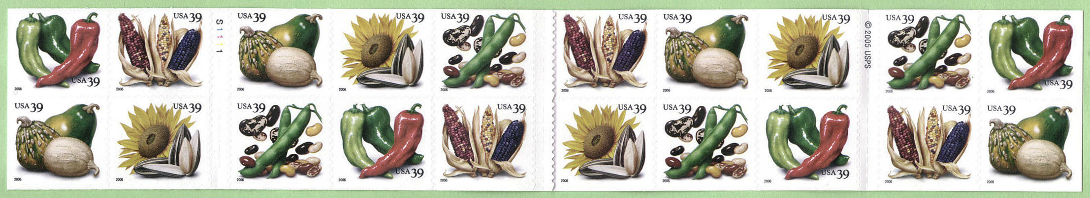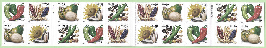Individual Scott numbers are: • 4013 - Chili Peppers • 4014 - Corn • 4015 - Squashes • 4016 - Sunflower and seeds 4016a - Booklet pane of 4, #4013-4016 • 4017 - Beans 4017a - Horizontal strip of 5, #4013-4017 4017b - Booklet pane of 4, #4013-4015, #4017 4017c - Booklet pane of 6, #4013-4016, 2 #4017 4017d - Booklet pane of 6, #4013-4015, 4017, 2 #4016 |