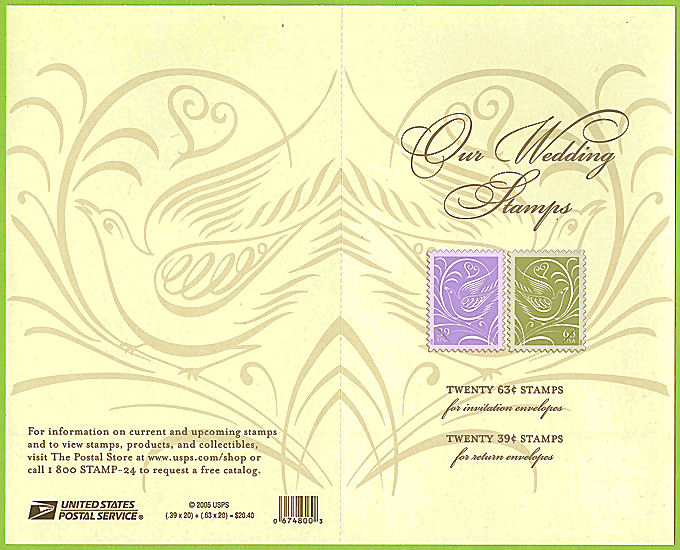 2005 USPS • Plate numbers Cover Side: © 2005 USPS • Barcode 674800 • "Our Wedding Stamps" stamp image • Promotional information • USPS Logo • Price $20.40 "TWENTY 63¢ STAMPS for invitation envelopes" "TWENTY 39¢ STAMPS for return envelopes" |