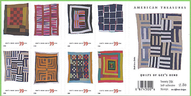 2005 USPS · Plate numbers Cover Side: "AMERICAN TREASURES" • Stamp image • "QUILTS OF GEE'S BEND" • "Twenty 39 cent Self-adhesive Stamps" • "Ten Different Designs" • "Sixth in a Series" • Price "$7.80" • Barcode "674500" |