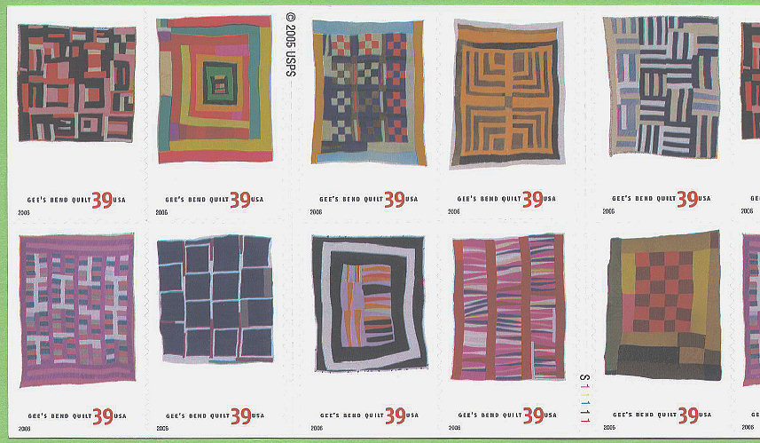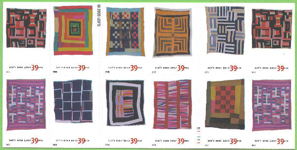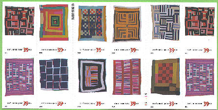 Individual Scott numbers are: • 4089 - 39¢ Housetop Variation, by Mary Lee Bendolph • 4090 - 39¢ Pig in a Pen Medallion, by Minnie Sue Coleman • 4091 - 39¢ Nine Patch, by Ruth P. Moseley • 4092 - 39¢ Housetop Four Block Half Log Cabin Variation, by Lottie Mooney • 4093 - 39¢ Roman Stripes Variation, by Loretta Pettway • 4094 - 39¢ Chinese Coins Variation, by Arlonzia Pettway • 4095 - 39¢ Blocks and Stripes, by Annie Mae Young • 4096 - 39¢ Medallion, by Loretta Pettway • 4097 - 39¢ Bars and String-pieced Columns, by Jessie T. Pettway • 4098 - 39¢ Medallion With Checkerboard Center, by Patty Ann Williams 4098a - Horizontal block of 10, #4089-4098 4098b - Double-sided convertible booklet of 20, 2 each #4089-4098 There are no descriptions on the Gee's Bend Quilt stamps. No. 4098a, from the side of the booklet with 12 stamps, is a block five stamps across by two stamps down. Nos. 4089 and 4094 are at the upper left and lower left sides of this block of ten, and also are the two remaining stamps on that side of the booklet. |