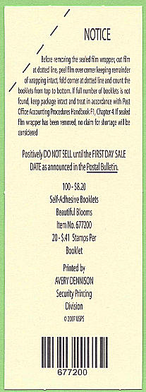Cover Side: Barcode (677200) • “Beautiful Blooms” • Stamp image • Price