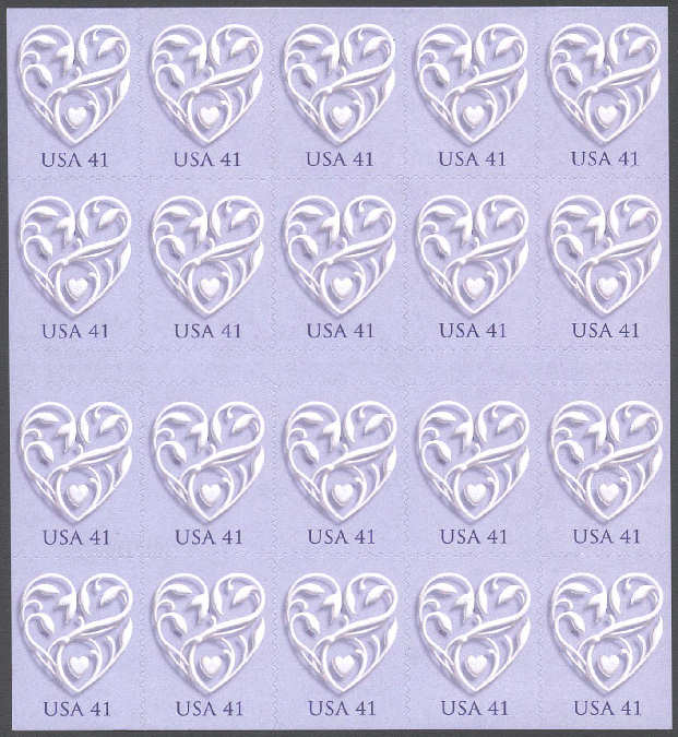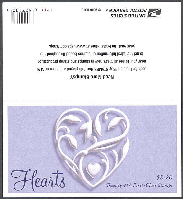 Margin Markings | © 2006 USPS • Barcode (677100) • Stamp image • Promotional Information • USPS Logo • Price “$8.20” • “Hearts” • "Twenty 41¢ First-Class Stamps" |