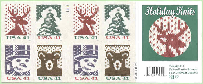 Markings | © 2006 USPS • Plate numbers • Partial stamp image • "Holiday Knits" • “Twenty 41¢ Self-adhesive Stamps • Four Different Designs” • Price “$8.20” • Barcode “676400” | ||||||