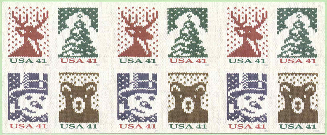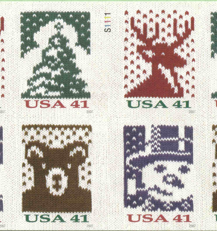 York, the Postal In celebration of the winter holiday season, the Postal Service will produce these four stamps featuring classic Christmas-time imagery designed and machine knitted by nationally known illustrator Nancy Stahl of New York, New York. Inspired by traditional Norwegian sweaters and knitted Christmas stockings, Stahl decided on “something cozy” for this year’s holiday stamp issuance. There’s a dignified stag, a snow-dappled evergreen tree, a perky snowman sporting a top hat, and a whimsical teddy bear, each of which is sure to add an extra touch of warmth to seasonal correspondence. The stamps will be issued in the following formats: