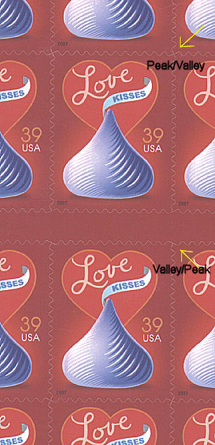 Horizontal Die cuts on the top block of ten stamps are peak/valley, while
