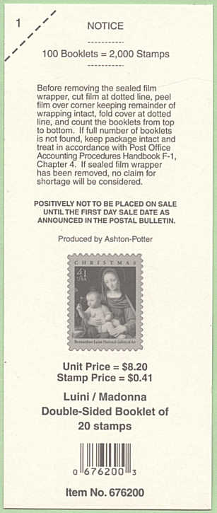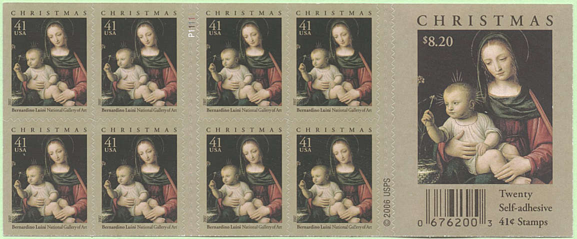 On October 25, 2007, in New York, New York, the Postal Service™ will issue a 41-cent Christmas: The Madonna of the Carnation by Bernardino Luini special stamp in one design in a pressure-sensitive adhesive (PSA) double-sided book of 20 stamps (Item 676200). Designed by Richard Sheaff of Scottsdale, Arizona, the stamp goes on sale nationwide October 25, 2007. The stamp features an oil-on-panel painting entitled The Madonna of the Carnation by Milanese painter Bernardino Luini (circa 1480–1532). Dating to around 1515, the painting is now part of the Samuel H. Kress Collection at the National Gallery of Art in Washington, DC. The stamp art is considered a detail of the painting, as the original photograph was slightly cropped on all four sides to fit the stamp format. |