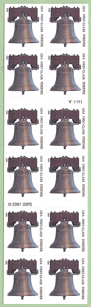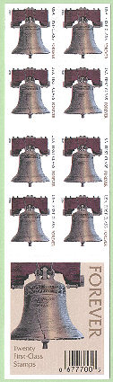 On August 22, 2008, in Falls Church, Virginia, the Postal Service™ will re-issue the nondenominated First-Class Mail® definitive, Forever Stamp™ (Liberty Bell) in one design in a pressure-sensitive adhesive (PSA) double–sided booklet of 20 stamps (Item 677700). The stamp, designed by Carl T. Herrman, Carlsbad, California, goes on sale nationwide August 22, 2008. The first 2008 doubled-sided convertible booklet of 20 was issued May 12, 2008. | ||