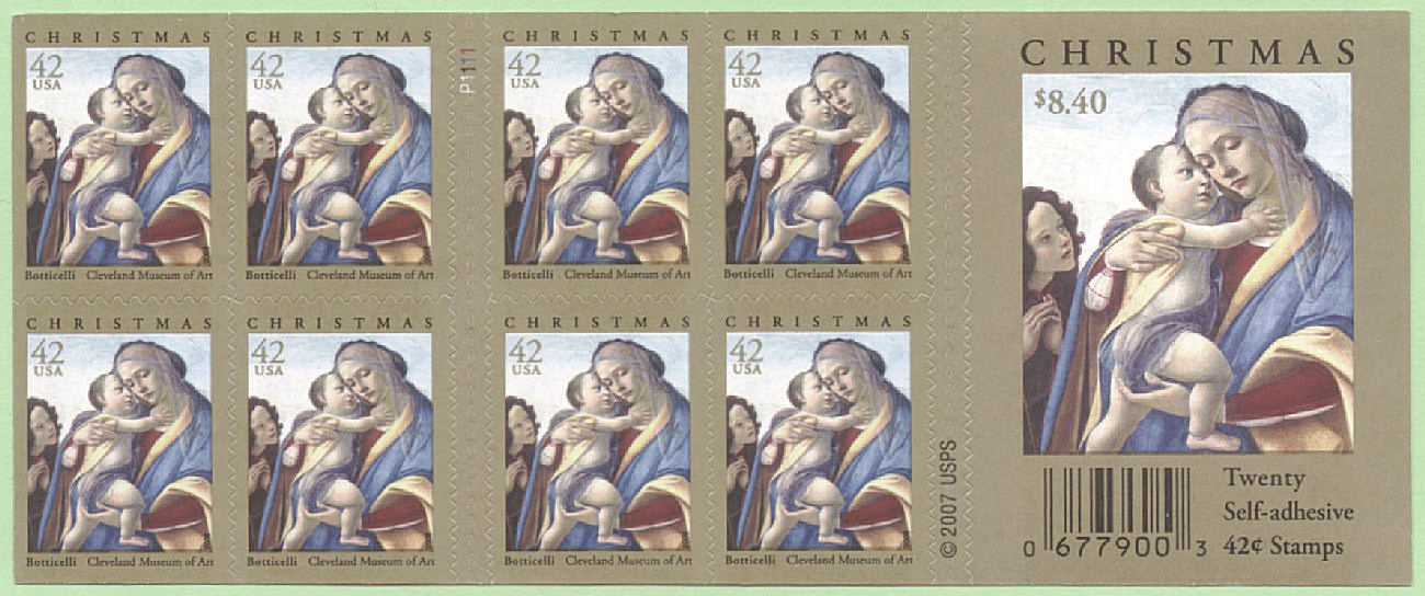 Markings | Cover Side: "© 2007 USPS" • Plate Numbers • Header "CHRISTMAS" • Stamp image • Price $8.40 • "Twenty Self-adhesive 42¢ Stamps • Barcode 677900 |